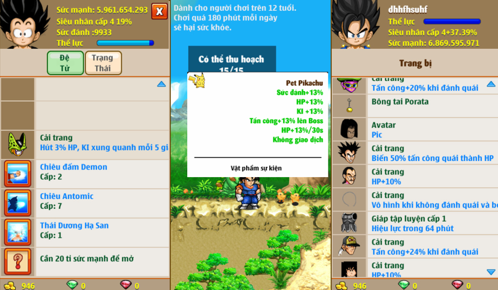 - Ms 4605 (tặng kèm 80 ngọc) – Trái đất 4ti5 dt 482tr, atomic c2, có btai, pet #pikachu, thùng rác, ct goku SSJ3, ct goku, ct apk 13, frost 2, skill 77711034