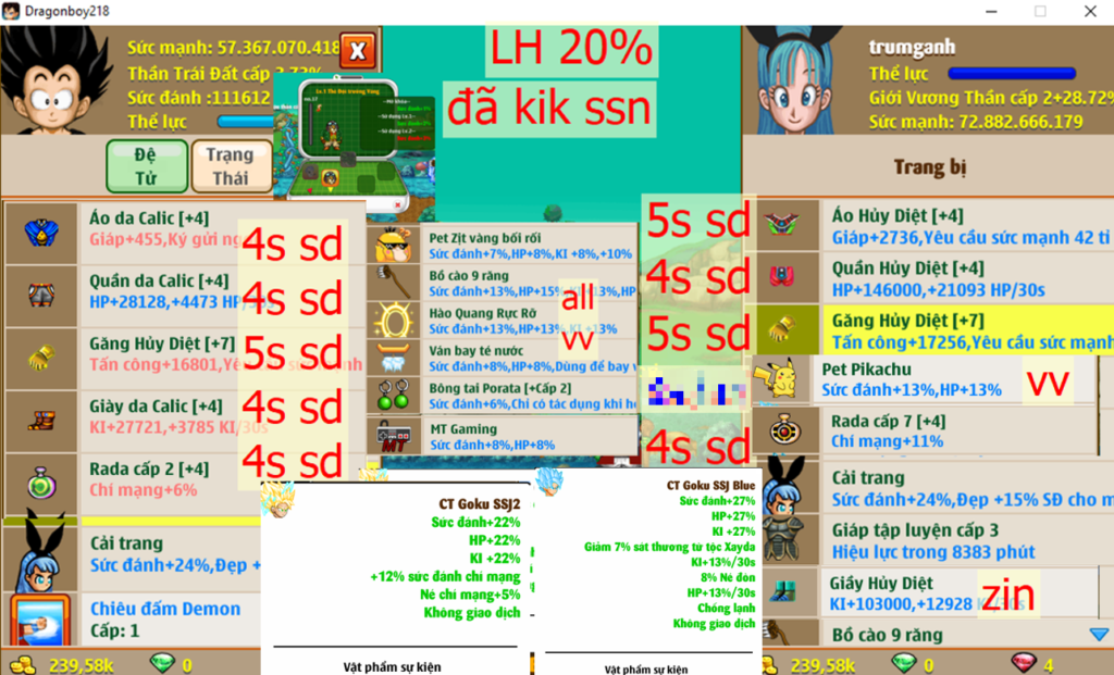 - Ms 6352 (kèm 175 ngọc) – Nameck 21ti dt 4ti, kame ttnl, LH 13%, pet #pikachu, ct goku SSJ, x2 apk 13, apk 20, apk 19 14 15