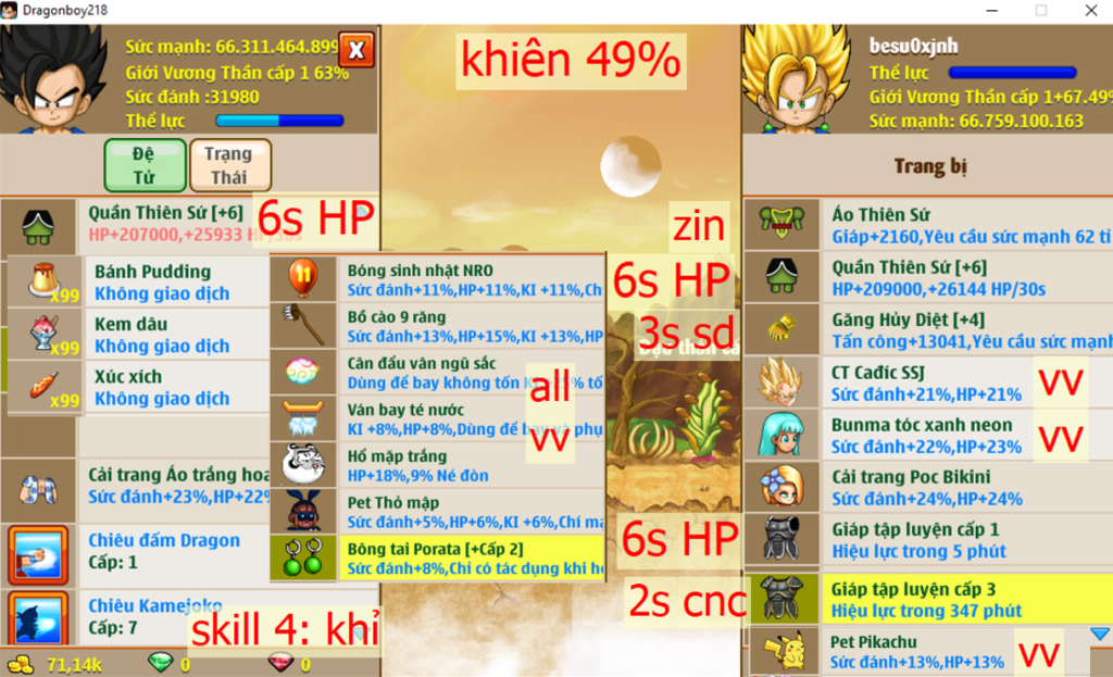 - Ms 6130 (tặng all đồ) – Xayda chơi HP sd #asasinl2l ván pet đeo lưng đầy đủ, x1 nón, x1 thỏ, x2 w hd c6 3s HP, x2 áo hd 3s HP, x1 găng hd 3s sd, ct goku ssj2, …