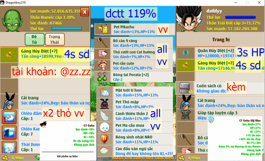 - Ms 4469 – Trái đất 40ti dt 24ti atomic ttnl trứng, dctt 66%, glt c2, pet #pikachu, (CT cadic SSJ Blue vv), ct cell con, chichi vv, hợp thể, vô hình, apk 20, ơ dơ, apk 13, bông băng, frost3, số 2, skill 77777776
