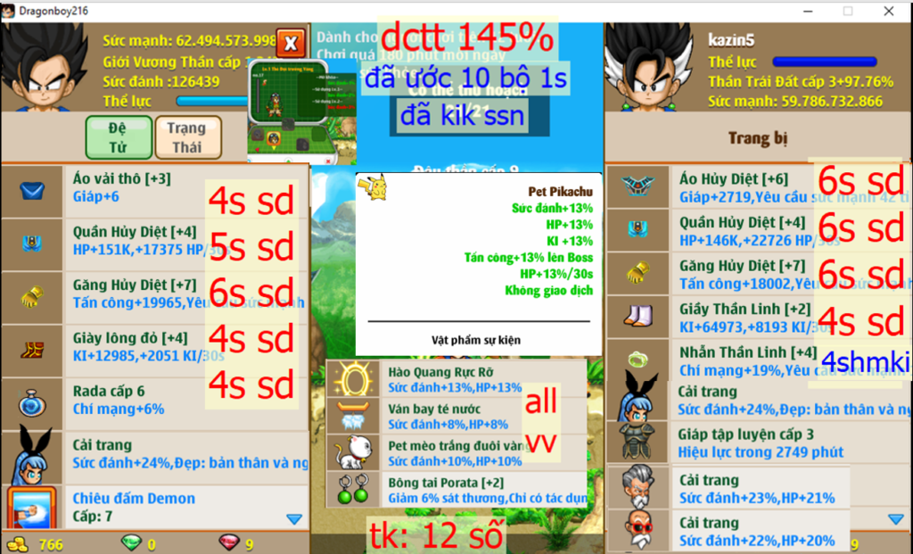 - Ms 4404 – Trái đất 41ti dt 41ti, kame tdhs khiên, dctt 146%, glt2, csdb, pet #pikachu, ct goku ssj blue, ct goku ssj2, ct cell con, số 2, avt 1s, apk 20, vô hình, apk 13, skill 77775666
