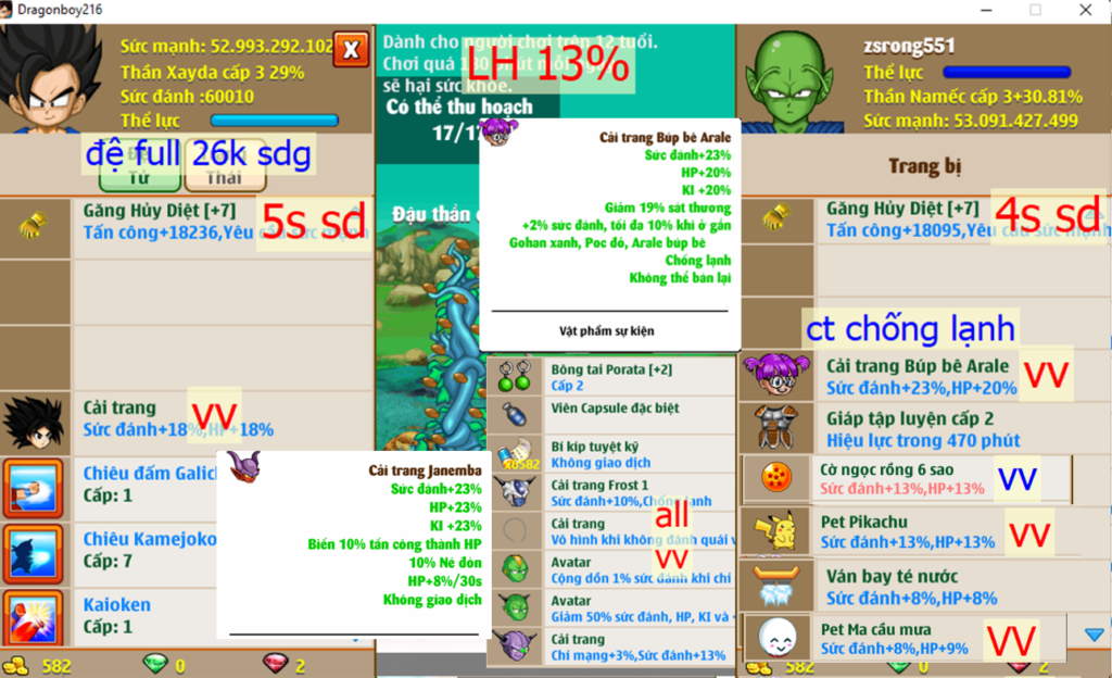 [SV2] Ms 6383 – Nameck 53ti dt 52ti (đệ full 26k sdg), LH 13%, x2 găng hd c7 5s4s, btc2 zin, csdb, giáp c2, cờ nr 6s, ván té nước, pet #pikachu, ct arale chống lạnh, ct janemba, ct caulifla, frost 1, vh, tiểu đội trưởng,