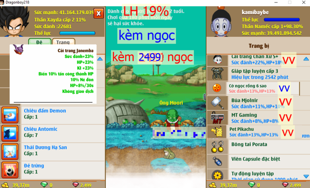 [SV2] (đã bán) Ms 6389 (kèm 2499 ngọc) – Nameck 39ti dt 41ti, atomic tdhs trứng, LH 19%, pet #pikachu, ct chan xư s, ct janemba, giáp c3, csdb, ván MT, búa Mjolnir, cờ nro 6s