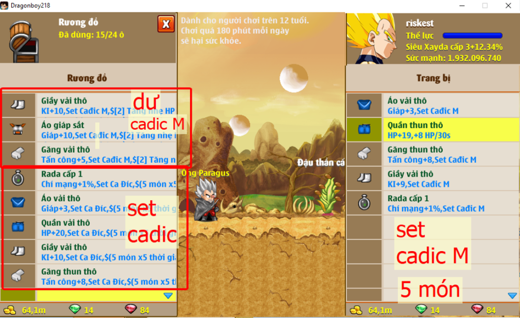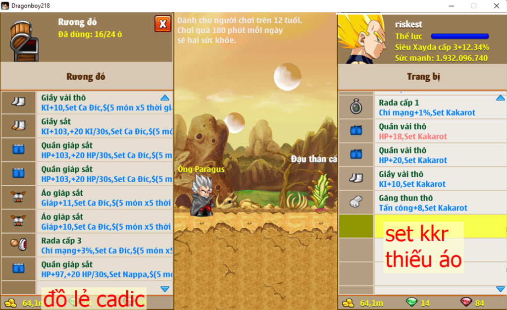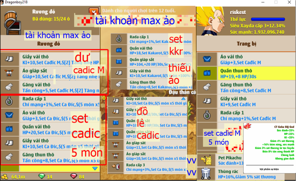 [SV2] (đã bán) Ms 6500 – Xayda 2 set kh id đẹp #riskest, 1 set cadic M 5 món (dư 3 món) + 1 set cadic 5 món (dư 7 món), có 1 set kkr 4 món (thiếu áo) [all đồ zin], ct goku ssj god, pet pikachu