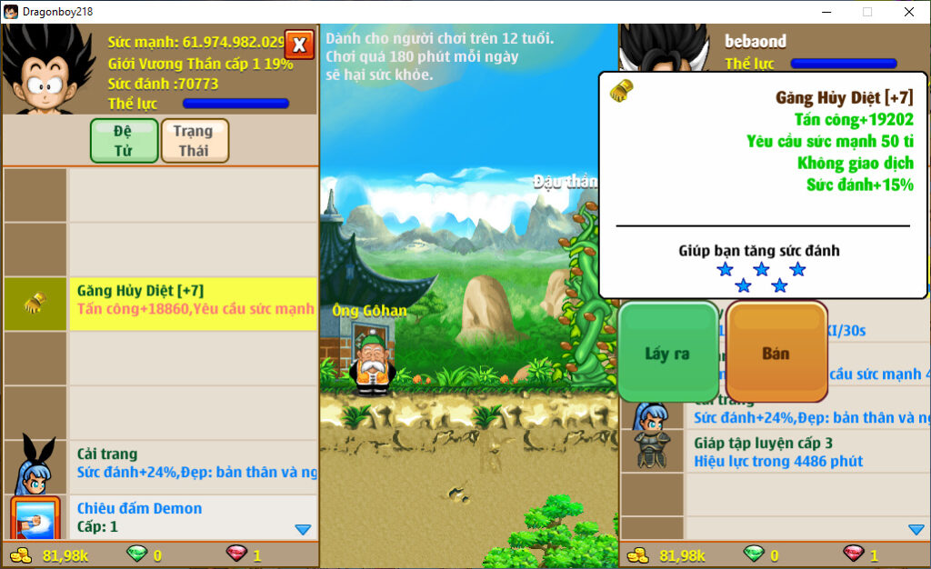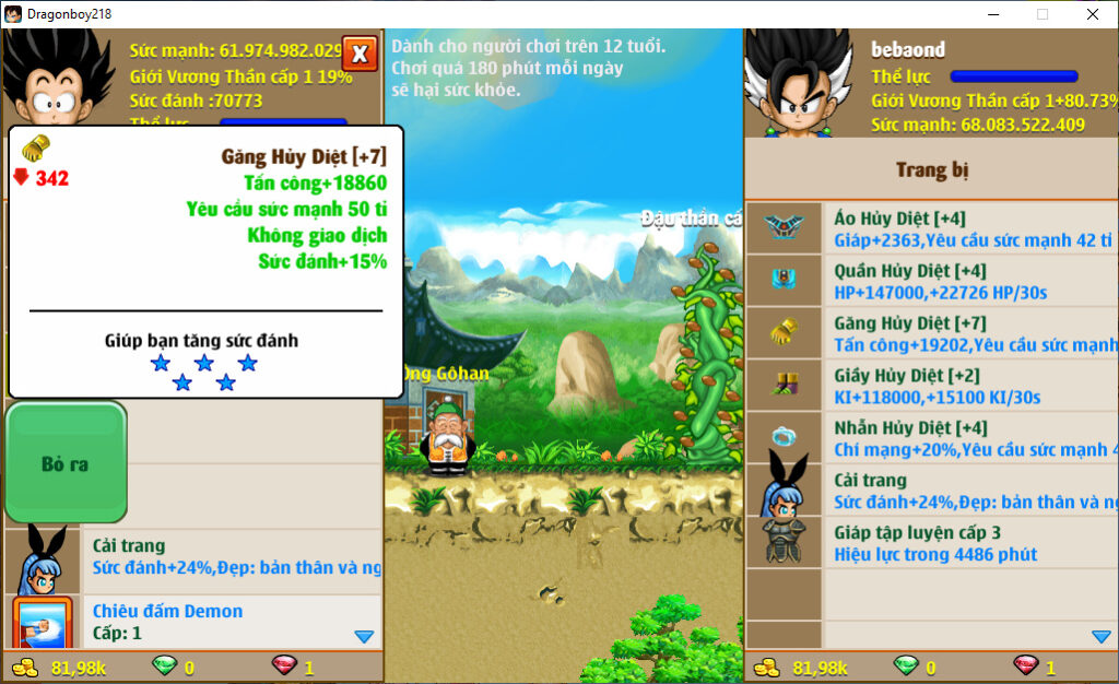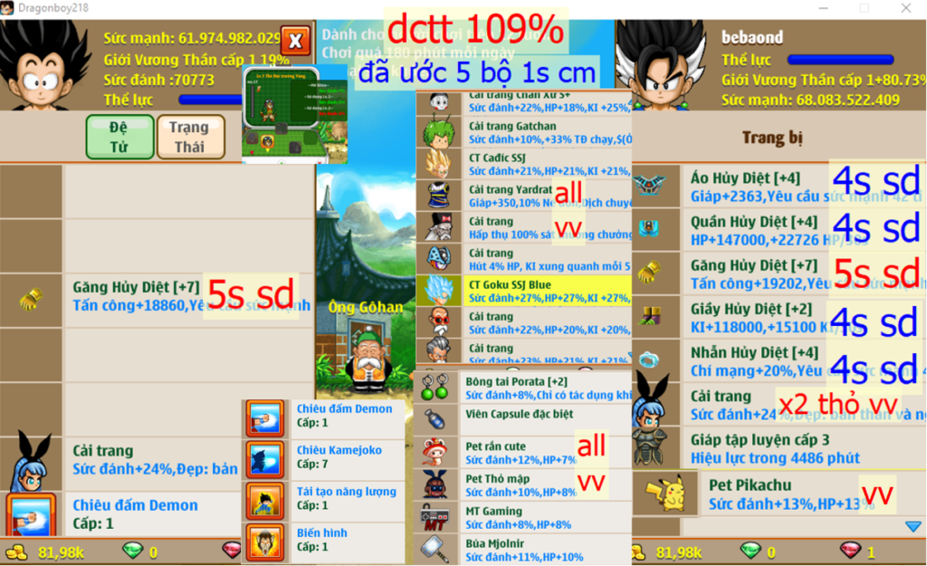 - Ms 4605 (tặng kèm 80 ngọc) – Trái đất 4ti5 dt 482tr, atomic c2, có btai, pet #pikachu, thùng rác, ct goku SSJ3, ct goku, ct apk 13, frost 2, skill 77711034