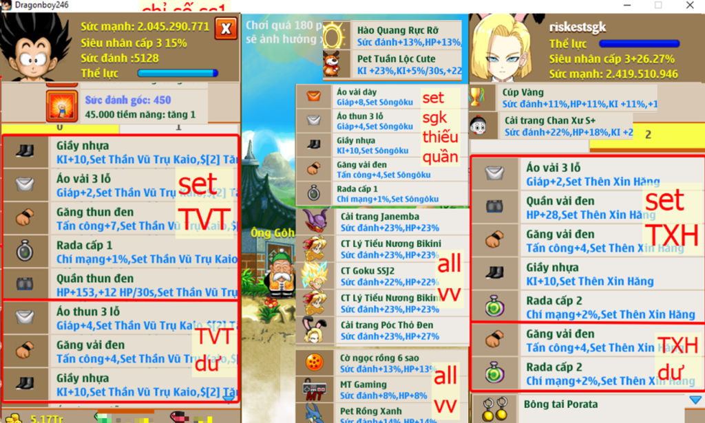 - Ms 6534 (ko đồ) – Trái đất đủ set kirin, dctt 72%, phụ kiện đầy đủ, nhiều cải trang, set songoku (thiếu rada), set TVT kaio (thiếu giày), (về đua top kiếm 1 món nữa ngon luôn)
