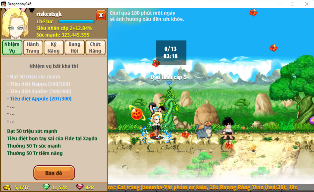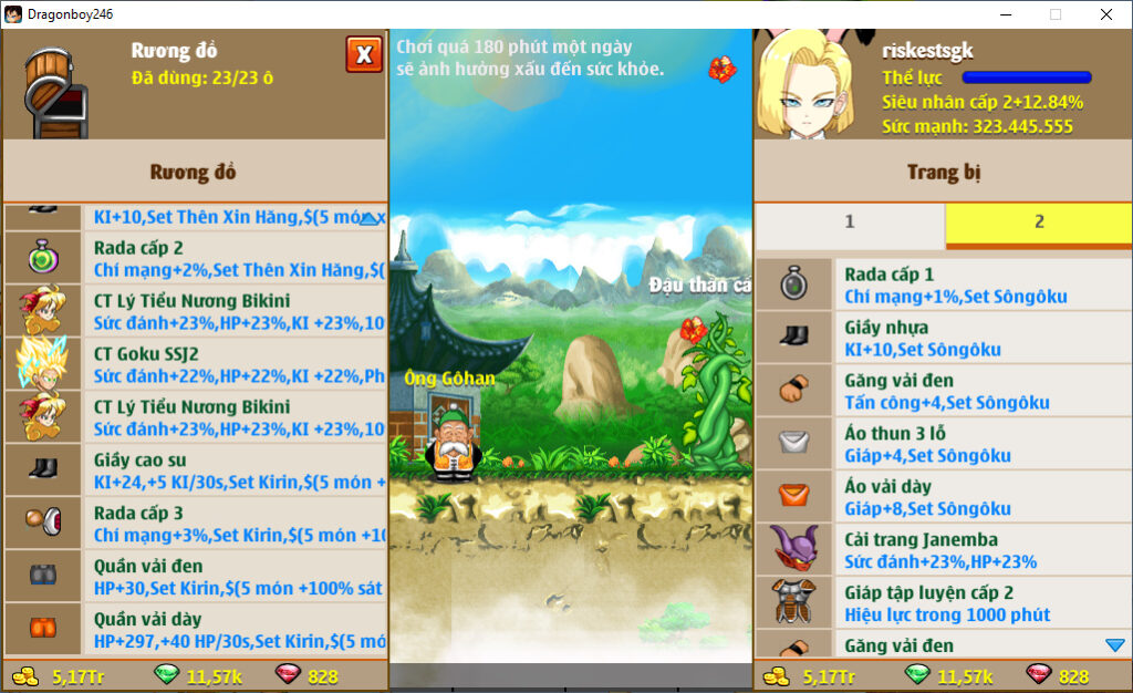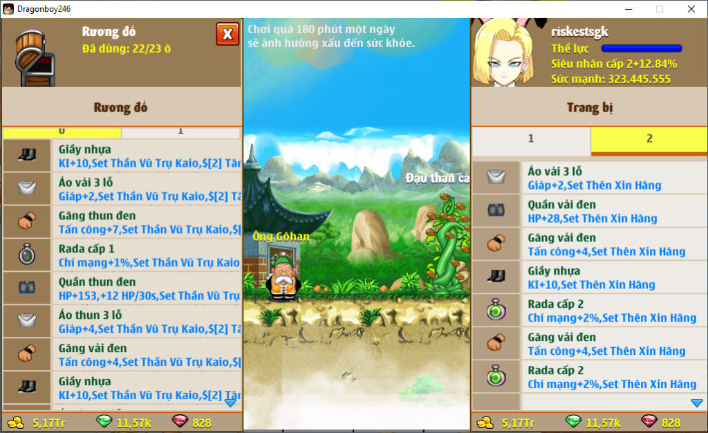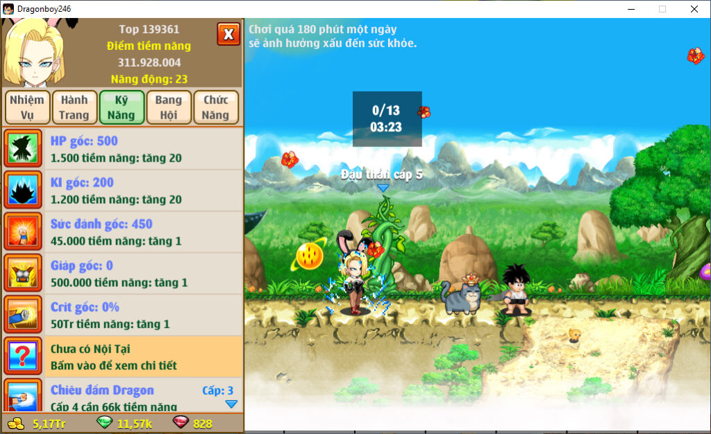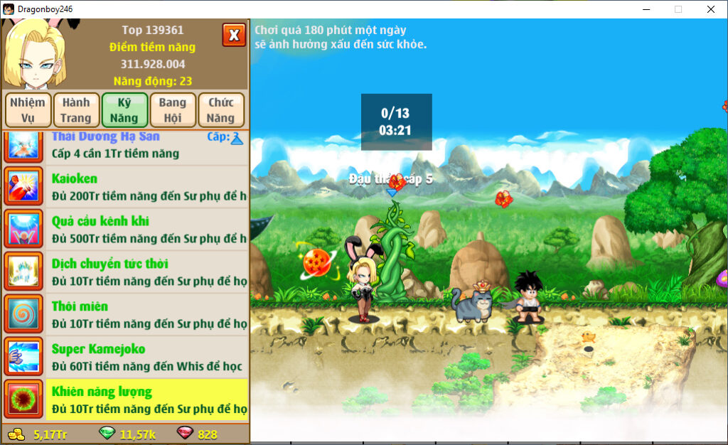 - Ms 4605 (tặng kèm 40 ngọc) – Trái đất 4ti5 dt 482tr, atomic c2, có btai, pet #pikachu, thùng rác, ct goku SSJ3, ct goku, ct apk 13, frost 2, skill 77711034