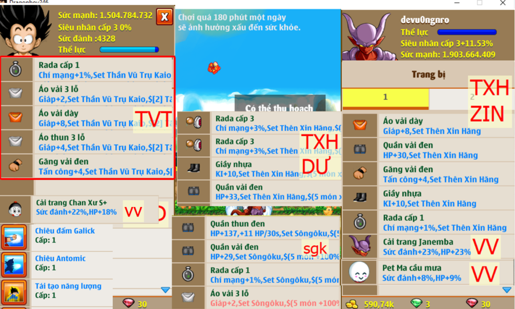 - Ms 6621 – Trái đất ti7 dt 1ti5, atomic tdhs, set TVT đủ 5 món (có dư), set TXH đủ 5 món (có dư), đã kik rồng, phụ kiện đầy đủ, x3 ct cadic ssj blue (có tc boss 17%), ct apk 21 thân thiện, póc thỏ đen, ct kirin chú cuội, …
