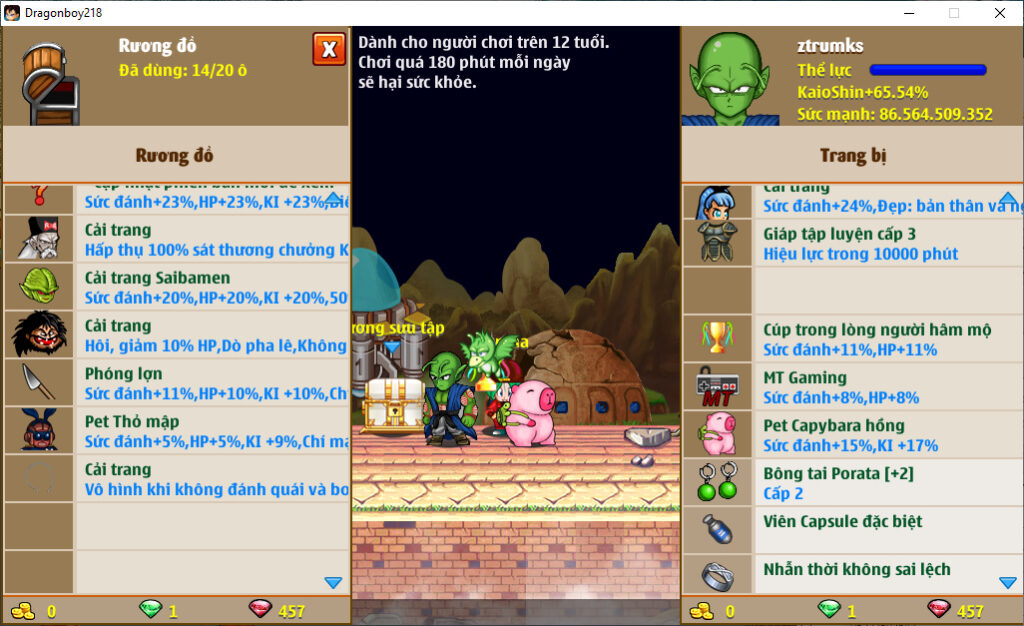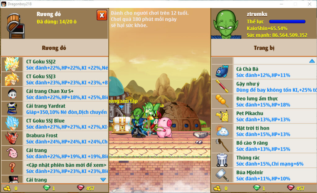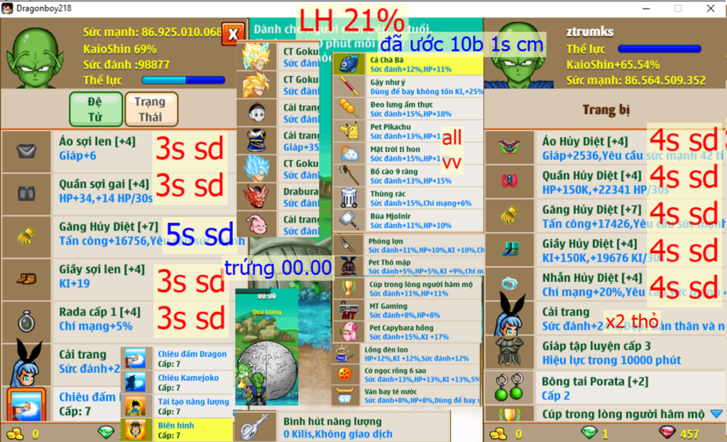 - Ms 6383 – Nameck 53ti dt 52ti (đệ full 26k sdg), LH 13%, x2 găng hd c7 5s4s, btc2 zin, csdb, giáp c2, cờ nr 6s, ván té nước, pet #pikachu, ct arale chống lạnh, ct janemba, ct caulifla, frost 1, vh, tiểu đội trưởng,