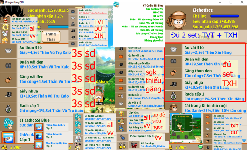 [SV2] Ms 6621 – Trái đất ti7 dt 1ti5, atomic tdhs, set TVT đủ 5 món (có dư), set TXH đủ 5 món (có dư), đã kik rồng, phụ kiện đầy đủ, x3 ct cadic ssj blue (có tc boss 17%), ct apk 21 thân thiện, póc thỏ đen, ct kirin chú cuội, …
