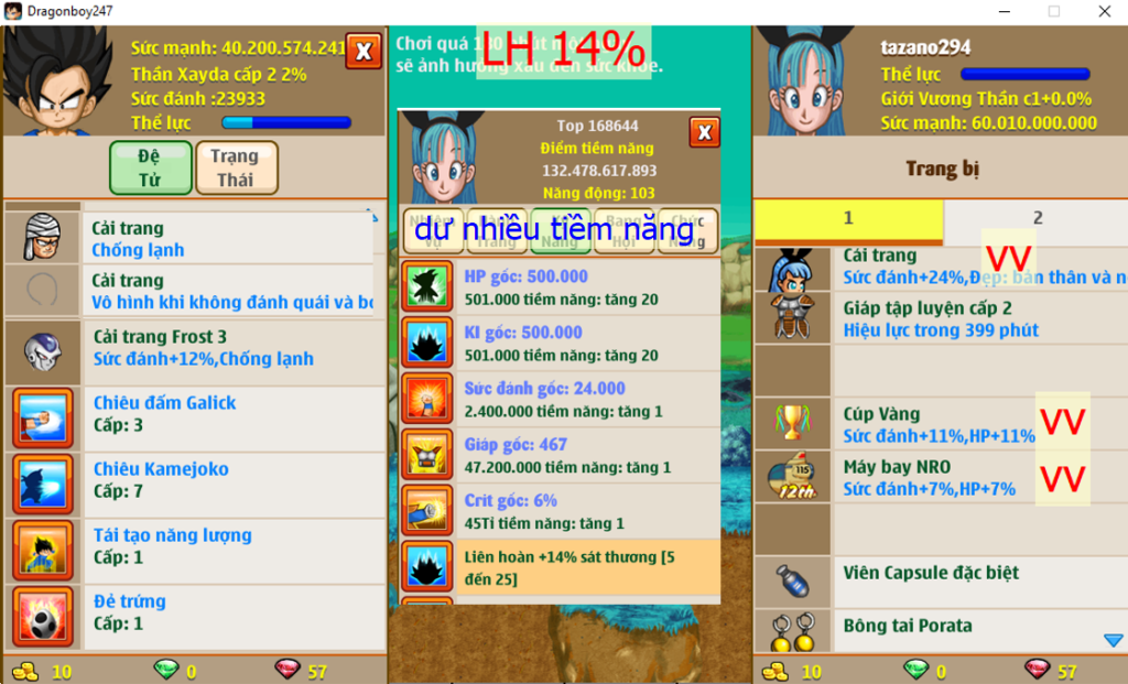 - Ms 6615 – Namec 26ti dt 20ti, atm ttnl trứng, LH 12%, x2 ct goku ssj 2, chan xư s, cúp, …