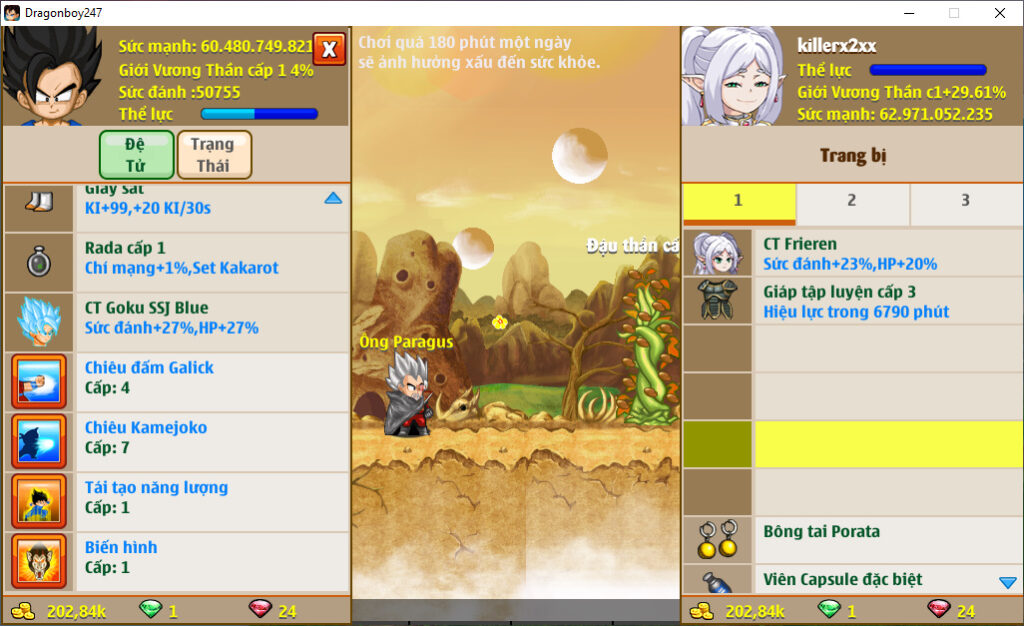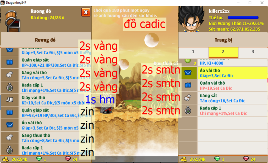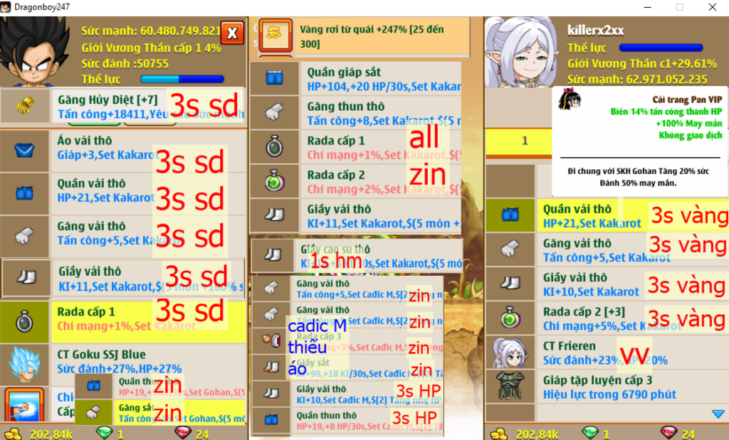 [SV2] Ms 6633 – Xayda id #killerx2xx, set kakarot + cadic (có set cadic M thiếu áo), phụ kiện đầy đủ, ct frieren, goku blue, ct pan vip vv