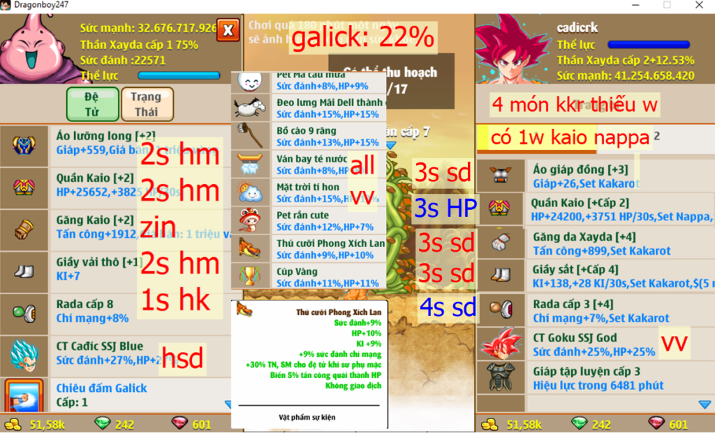 - Ms 6134 – Siêu phẩm xayda khiên 54 #lgajxg6k w ts 8s (+ thêm 3% hp), glt 7s, áo ts 6s, w hd 5s, pet giáp capybara ba lô vv, x1 thỏ, x1 mị,… phụ kiện đầy đủ (mình có đồ giáp67s cho ae về phối theo ý thích nha)