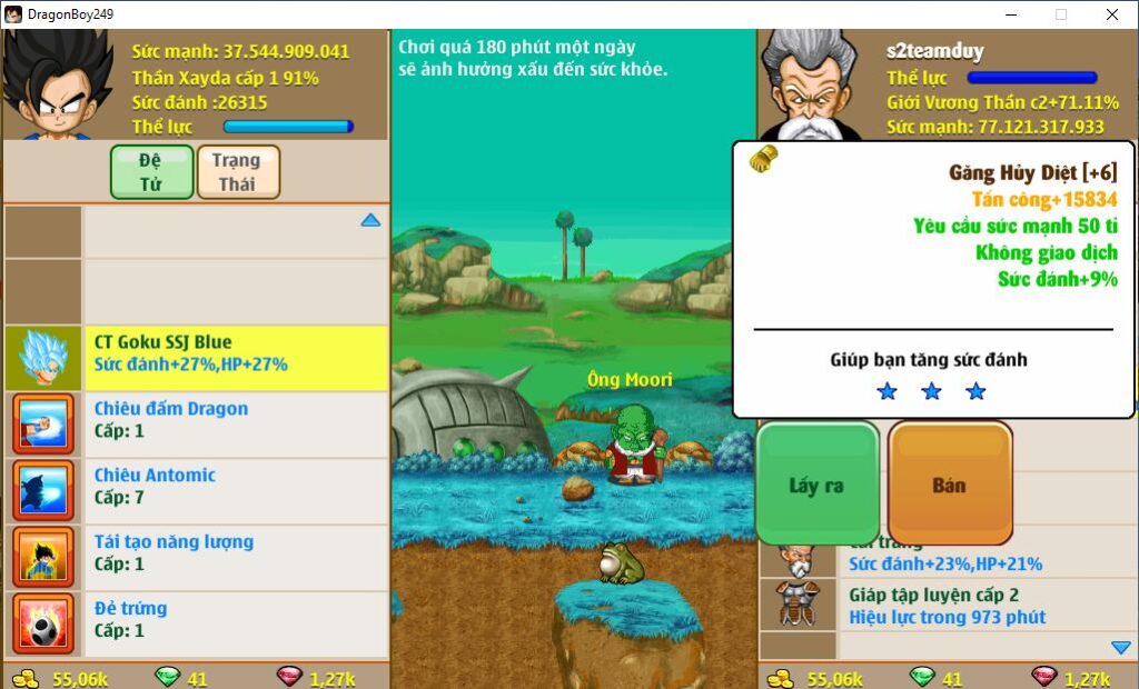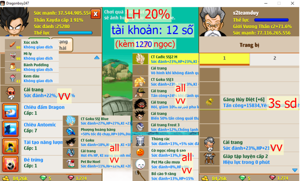 [SV2] Ms 6640 (kèm 1270 ngọc) – Nameck 77ti dt 37ti, atomic ttnl trứng, LH 20%, x1 găng hd c6 3s sd, ct x3x4, cadic ssj M, goku ssj3, frost3, goku blue, cell con,….