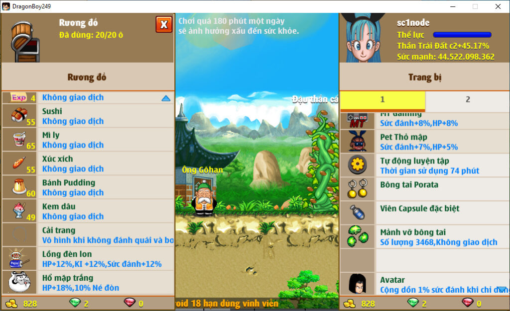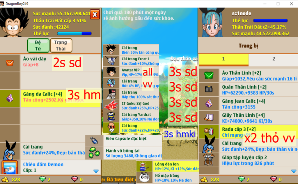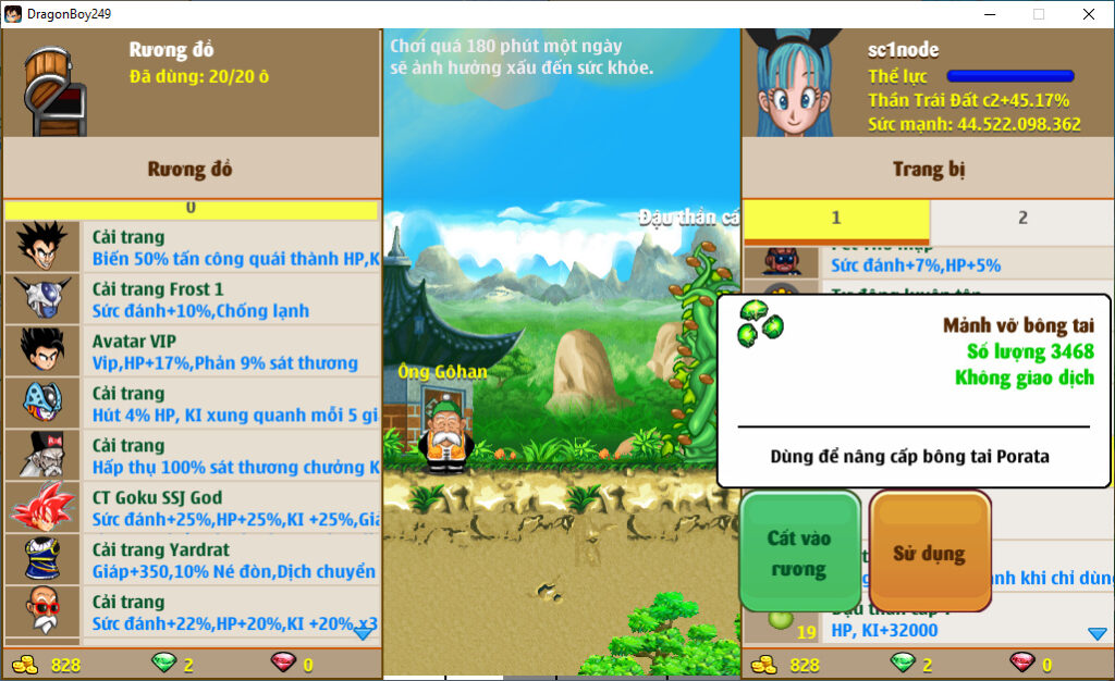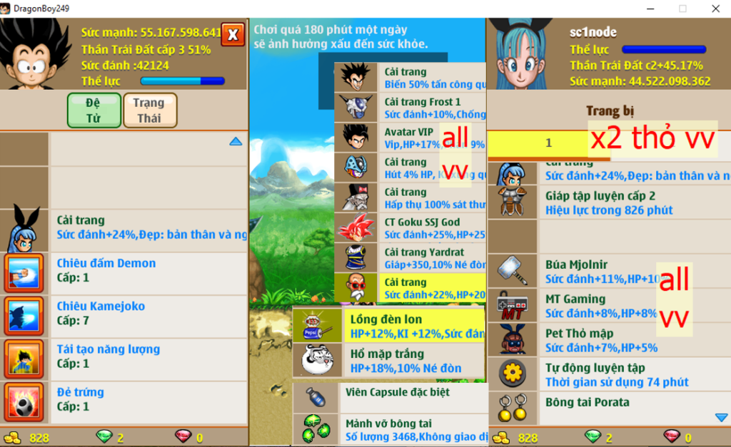 - Ms 6534 (ko đồ) – Trái đất đủ set kirin, dctt 72%, phụ kiện đầy đủ, nhiều cải trang, set songoku (thiếu rada), set TVT kaio (thiếu giày), (về đua top kiếm 1 món nữa ngon luôn)