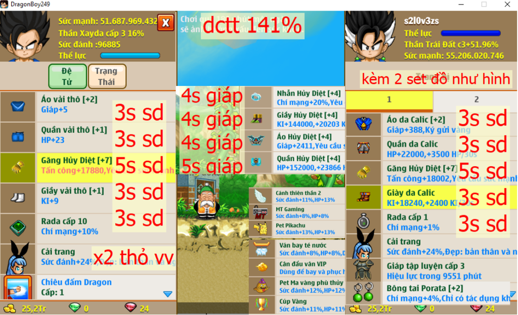 - Ms 6534 (ko đồ) – Trái đất đủ set kirin, dctt 72%, phụ kiện đầy đủ, nhiều cải trang, set songoku (thiếu rada), set TVT kaio (thiếu giày), (về đua top kiếm 1 món nữa ngon luôn)